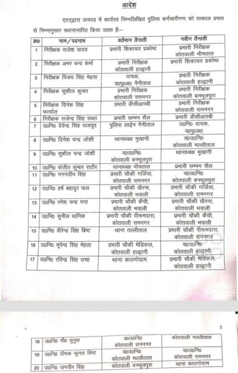 हल्द्वानी-बदले गए कोतवाल, बनभूलपुरा में इन्हें मिली नवीन तैनाती, पुलिस महकमे में बड़ा फेरबदल….लिस्ट देखिये