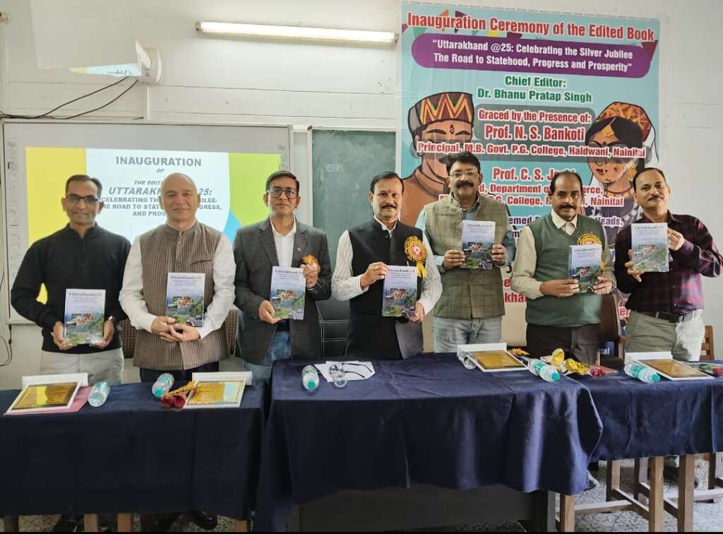 एम.बी.जी.पी.जी. कॉलेज हल्द्वानी के वाणिज्य विभाग में एक विशेष अवसर पर पुस्तक “Uttarakhand@25: Celebrating the Silver Jubilee the Road to Statehood, Progress and Prosperity” का विमोचन किया गया। इस पुस्तक को असिस्टेंट प्रोफेसर डॉ. भानु प्रताप सिंह और अमित बेलवाल ने संपादित किया है। कार्यक्रम का उद्घाटन मुख्य अतिथि, प्रो. एन.एस. बनकोटी, प्राचार्य, एम.बी.जी.पी.जी. कॉलेज हल्द्वानी द्वारा किया गया। इस अवसर पर अन्य गणमान्य अतिथि भी उपस्थित रहे, जिनमें प्रो. पंकज कुमार, विभागाध्यक्ष, अर्थशास्त्र विभाग, प्रो. सी.एस. नेगी, विभागाध्यक्ष, जंतु विज्ञान विभाग, प्रो. सी. जोशी, विभागाध्यक्ष, वाणिज्य विभाग, सुमित जोशी, सीनियर एडिटर, दैनिक जागरण हल्द्वानी आदि शामिल थे।